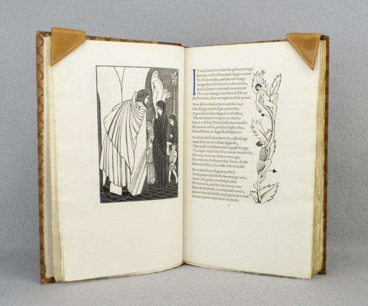 Ein Schmuckstück hergestellt von der Golden Cockerel Press, die auf die Herstellung schöner Ausgaben von Klassikern und neuen Büchern spezialisiert war. Troilus and Criseyde gelten nach den Canterbury Tales als zweitwichtigstes Werk des Verlags – und das obwohl die Holzschnitte von Eric Gill von vielen als zu freizügig betrachtet wurden. Verkauft wurde eins von nur 219 nummerierten Exemplaren.