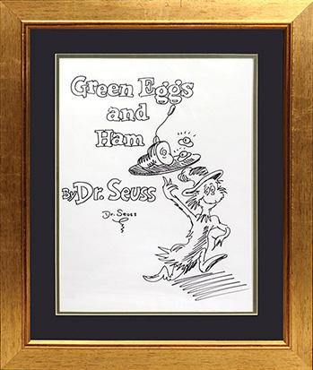Der amerikanische Illustrator und Kinderbuchautor Theodor Seuss Geisel, besser bekannt als Dr. Seuss, besitzt im angloamerikanischen Sprachraum Kultstatus. Seine Bücher sind besonders dafür bekannt, dass sie mit dem limitierten Wortschatz eines Kindes auskommen und trotzdem über einen ungeheuren Wortwitz verfügen. Die hier verkaufte signierte Originalzeichnung zeigt Sam-I-Am, die Hauptfigur von Green Eggs and Ham.