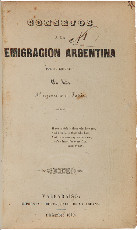 48pp. 12mo. 20th-century calf. Contemporary ink inscription on titlepage, small ink marks in upper-outer corner of pages. Occasional minor foxing on titlepage, light age toning in text. A very good copy. A rare mid-19th-century Valparaiso imprint encouraging Argentineans who had emigrated to Chile to return to their homeland. The work is addressed primarily to the exiles who had departed the country during the reign of dictator Juan Manuel de Rosas, who ruled Argentina from 1829 to 1852. "The tyrant enjoyed his power for a total of twenty-three years, from 1829 to 1852, and his 'sum total of power' for the last seventeen years of that period. Yet 'invulnerable' as Rosas seemed to be while he was dictator, his authority was gradually being weakened. Almost from the very first moment the intellectuals saw through his demagogy. After opposing it without success they fled into exile, where distance, separation, and loss gave them more strength and a better perspective than they could ever have achieved otherwise" - Crow. Martinez reflects at length on reasons why the exiles should return to Argentina, and calls for his fellow emigres to accompany him (here in translation): "Argentinos! The moment has already arrived for all of us to return to our homeland. Accept the counsel of one your companions in misfortune: your country is to be claimed." A curious work, with an epigraph from Lord Byron in English on the titlepage. A rare Chilean imprint, not in Palau or Sabin. OCLC records copies at Bancroft, Harvard, and the National Library of Chile. OCLC 14881281. Crow, THE EPIC OF LATIN AMERICA, p.591. Bestandsnummer des Verkäufers WRCAM36908