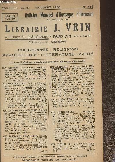 Lot de Bulletins de la librairie J. Vrin- n°454 - Octobre 1966