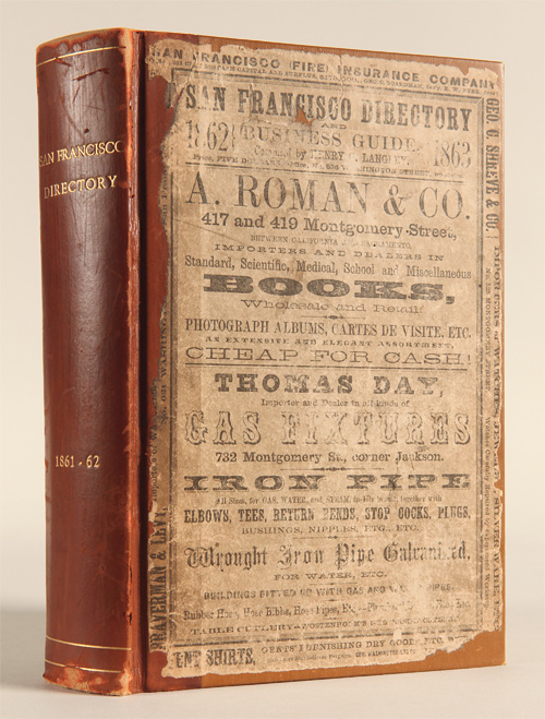 lvi,639pp. Modern sheep and cloth boards, original covers pasted on. Spine extremities worn. Initial leaves used as pastedowns, bookplate on front pastedown, manuscript ownership note on fore-edge. Light tanning, occasional foxing. No map present. Good plus. The fifth San Francisco directory published under the name of the compiler Henry Langley. In addition to alphabetical listings of inhabitants and businesses organized by trade, there are numerous advertisements, a street directory, and information about public officials and services. Although the title of the work claims a map, one is not present, nor does Greenwood call for one. GREENWOOD 1706. ROCQ 7988. Bestandsnummer des Verkäufers WRCAM52170