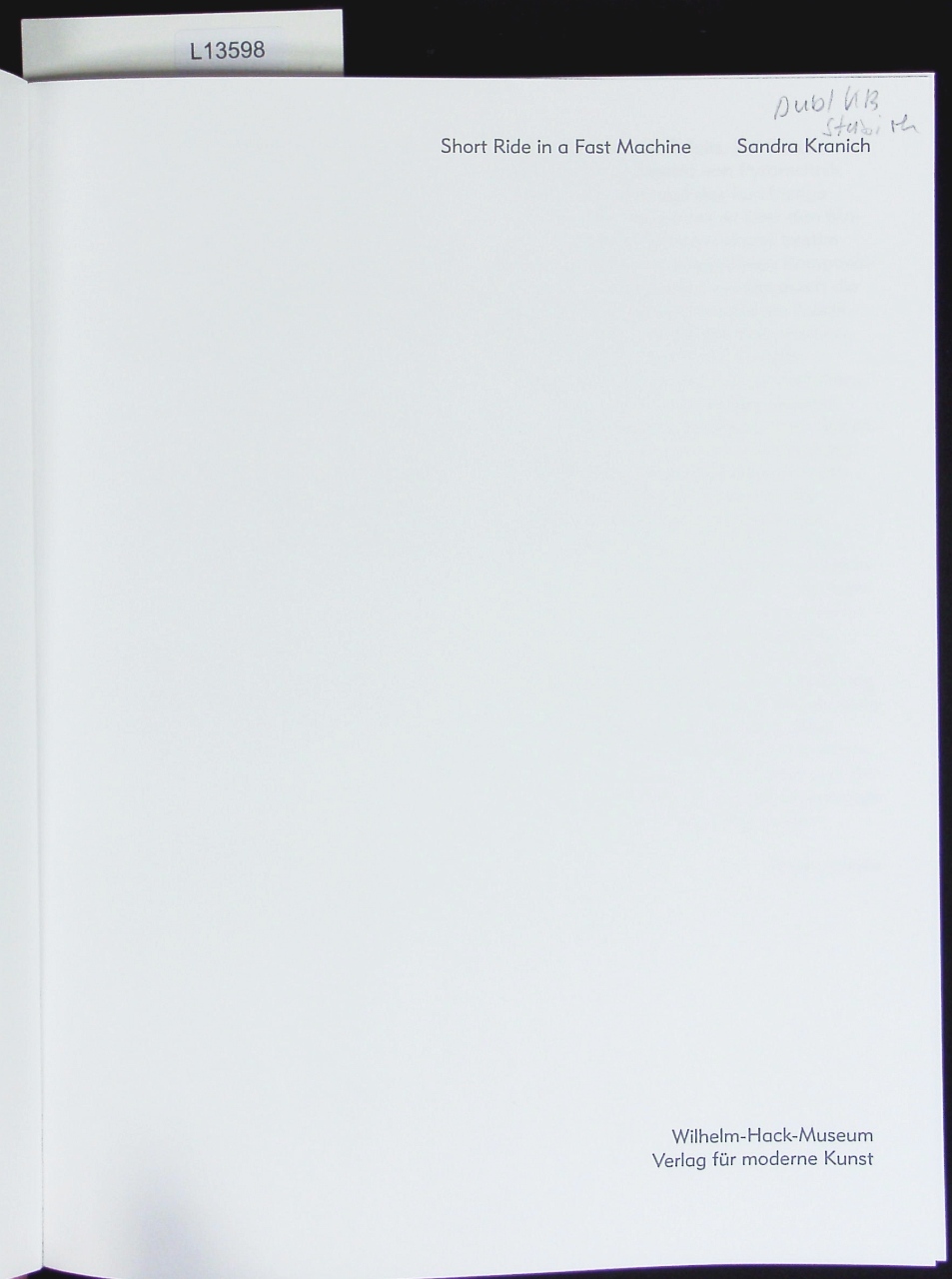 Short ride in a fast machine. Sandra Kranich ; [. anlässlich der Ausstellung "Sandra Kranich" Rudolf-Scharpf-Galerie, Wilhelm-Hack-Museum, Ludwigshafen am Rhein 14. März - 17. Mai 2015.