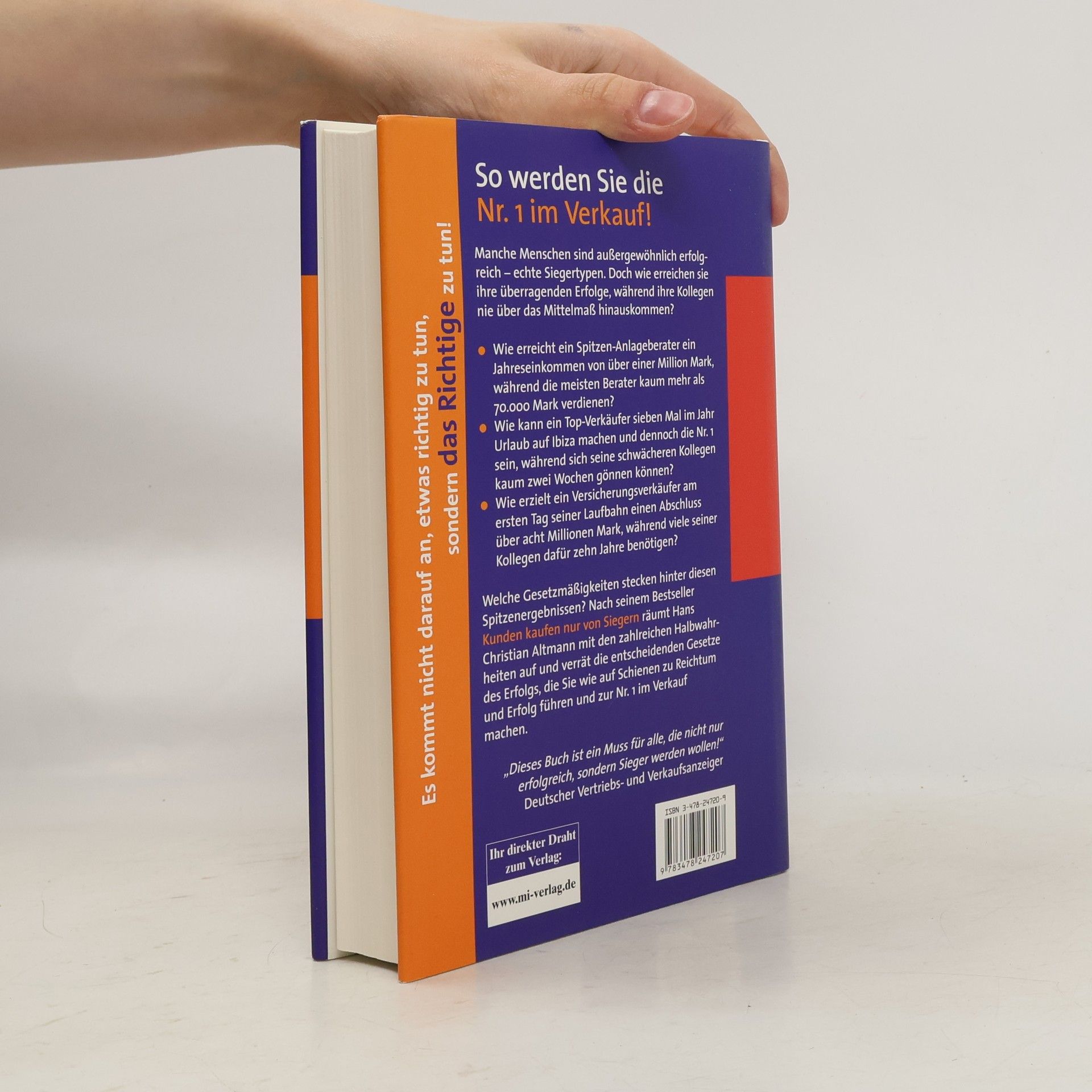 Jeder Mensch kann viel mehr aus seinem Potenzial machen, um der Beste zu werden, der er werden kann. Das ist die Botschaft von Altmann, die er mit Erfahrungen belegt. Voraussetzung dazu ist, dass jeder seine wahren Stärken erkennt, seine - oft unbewussten - Erfolgsblockaden abbaut und das "Mind-Set" der Sieger beherrscht. Dazu zählt z.B. die Fähigkeit, durch starke Wünsche energiespendende Emotionen zu wecken, attraktive Ziele zu definieren und Visionen auch unter Druck aufrecht zu erhalten . Sieger können sich jeden Tag neu motivieren. Das Buch spricht vor allem jene Menschen an, die ihrem Berufsleben eine entscheidende Wendung geben möchten. Die vielleicht das Gefühl haben, ihr volles Potenzial sei noch nicht ausgeschöpft, die also noch viel mehr erreichen könnten, als es gegenwärtig möglich erscheint. Dabei konzentriert sich die Darstellung auf die wichtigsten "Gesetzmäßigkeiten" des Erfolgs, die der Autor bereits in seinem Buch Kunden kaufen nur von Siegern erarbeitet hatte. Ergänzt werden sie von weiteren Erfolgsprinzipien aus geschichtlichen Beispieln, aus dem Sport und aus der Kunst. Altmanns Motto: "Der eine wartet, dass die Zeit sich wandelt. Der andere packt sie kräftig an und handelt" (Dante).