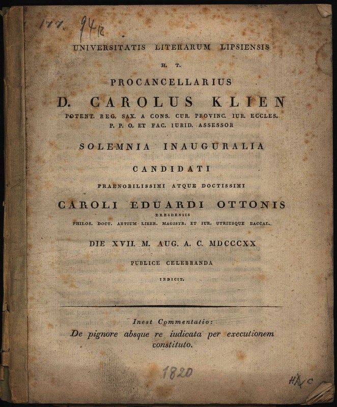 Universitatis Literarum Lipsiensis H. T. Procancellarius D. Carolus Klien . Solemnia Inauguralia Candidati . Caroli Eduardi Ottonis . Publice Celebranda Indicit Inest Commentatio De pignore absque re iudicata per executionem constituto