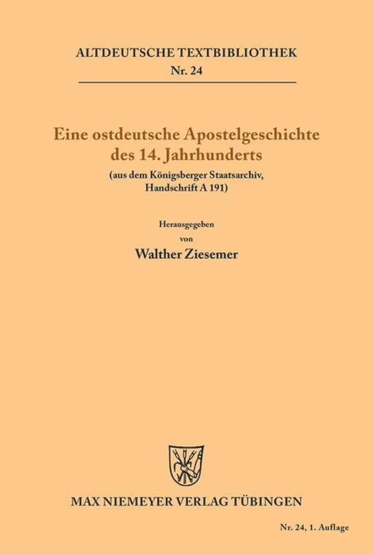 In den Warenkorb legenDieser Artikel ist ein Print on Demand Artikel und wird nach Ihrer Bestellung fuer Sie gedruckt. Keine ausfuehrliche Beschreibung fuer Eine ostdeutsche Apostelgeschichte des 14. Jahrhunderts verfuegbar.Die ATB ist die traditionsreichste Editionsreihe der germanistischen Mediaevistik. Begruendet 1881 von Hermann Paul, wurde sie von fuehrenden Fachvertre.